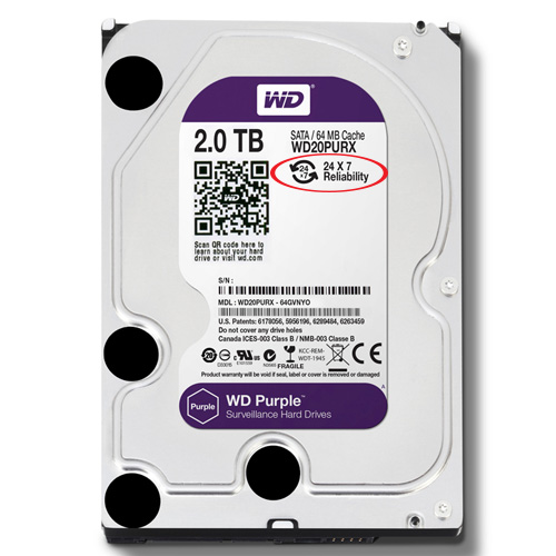 ( Hình khoanh tròn màu đỏ ổ cứng HDD Western Purple 2TB thể hiện ổ cứng cho phép hoạt động liên tục 24/24 )
